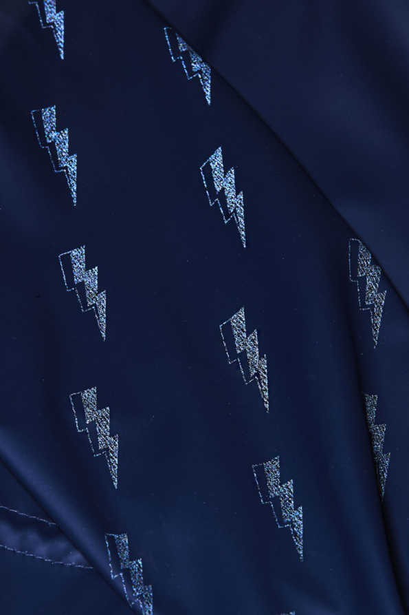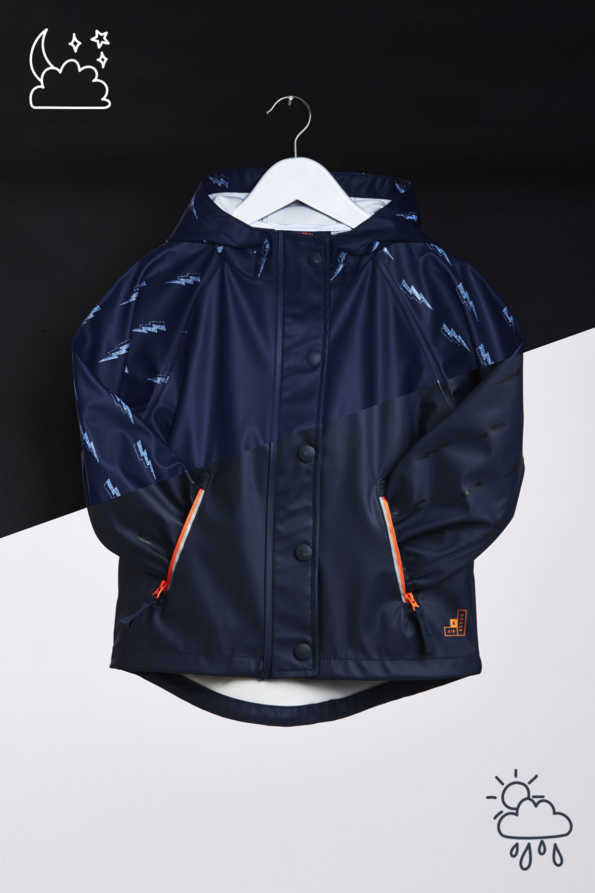 This Lightning Bolt Light Catcher by Grass & Air, is a reflective rain mac that reveals a lightning bolt pattern on the sleeves and hood when light hits the fabric.