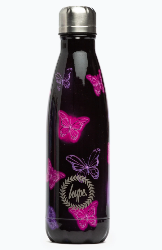 Keeping you hydrated, in style. Meet the HYPE. Pink and Purple Chrome Glow Butterfly Metal Reusable Water Bottle, perfect for when you’re on the go. Designed in aluminium to ensure your water stays ice-cold and your oat milk latte keeps warm for longer. Reuse it again and again with an airtight screw lid prevents spills. Hand wash only.
