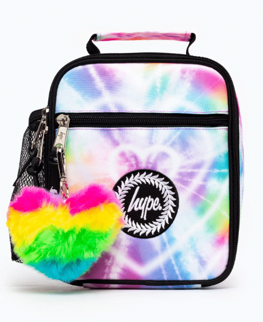The HYPE. Rainbow Heart Tie Dye Lunch Bag is designed in an all-over tie-dye inspired heart print in our standard lunch box shape. Featuring a grab handle and front pocket, perfect for storing your school lunch or as a cute picnic transporter. Boasting a mesh side pocket to store your HYPE. water bottle and inside thermal lining to keep your food fresh. Finished with the iconic HYPE. crest. Wipe clean only.