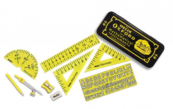 The High contrasting black and yellow design makes the contents of this maths set easier to read.