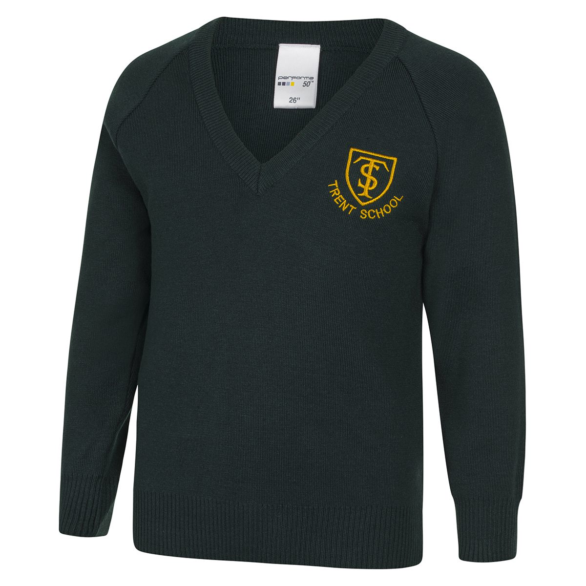 Bottle green v neck knited jumper with the Trent School logo